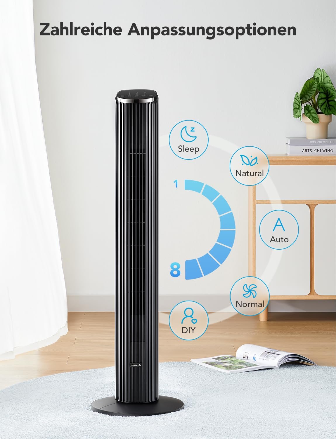 - Mehr Auswahl: Dieser Turmventilator verfügt über 5 Modi (Normal/Natürlich/Schlaf/Auto/benutzerdefinierte Kombination) und 8 Geschwindigkeitsstufen, um Ihren Körper abzukühlen und eine individuellere Kühlung zu gewährleisten. Es ist perfekt für Schlafzimmer, Wohnzimmer, Büros usw.