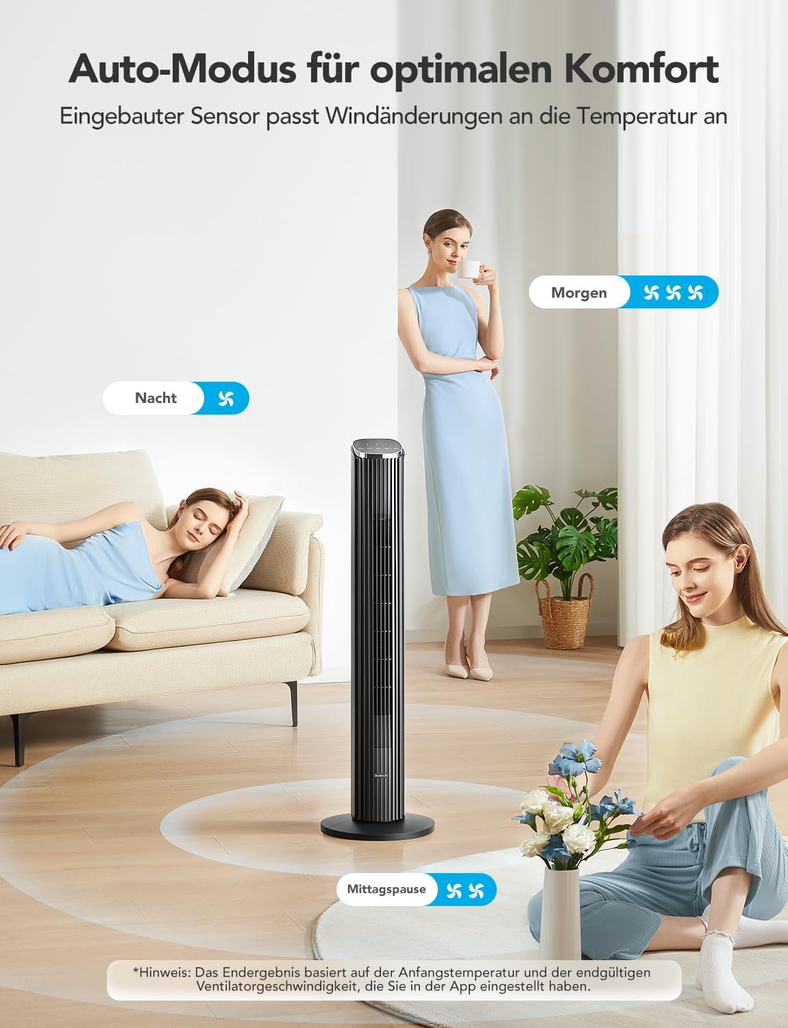 - Intelligente App- und Sprachsteuerung: Innerhalb von Sekunden verbindet sich der Turmventilator mit WLAN, Alexa und Google Assistant und ermöglicht so eine einfachere Steuerung überall und jederzeit. Die App ermöglicht Anpassungen wie Zeitplan, 24-Stunden-Timer, Modus-/Geschwindigkeitsanpassung usw.