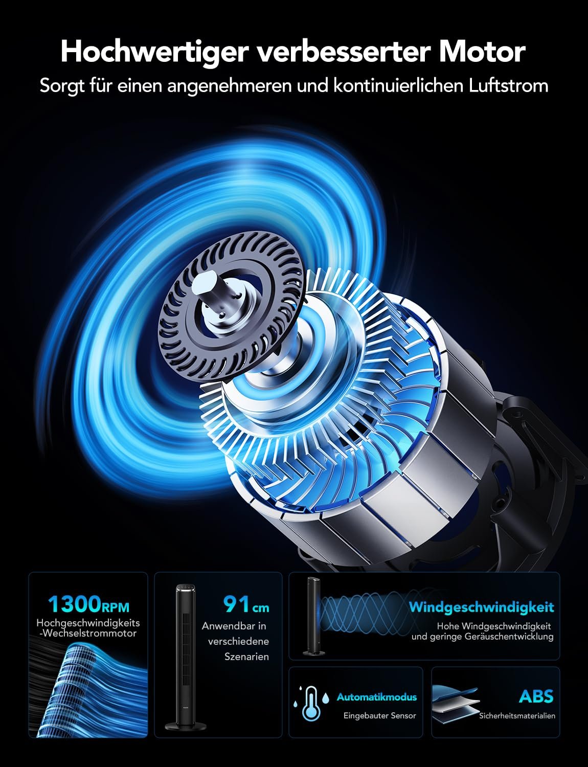 - Effiziente und schnelle Kühlung: Dieser Turmventilator verfügt über einen Hochgeschwindigkeits-Wechselstrommotor, der mit 1500 U/min läuft und eine Windgeschwindigkeit von bis zu 6,3 m/s für schnelle Kühlung erreicht. Er verfügt außerdem über einen Schwingwinkel von 75°, der eine lokalisierte Luftzirkulation gewährleistet.