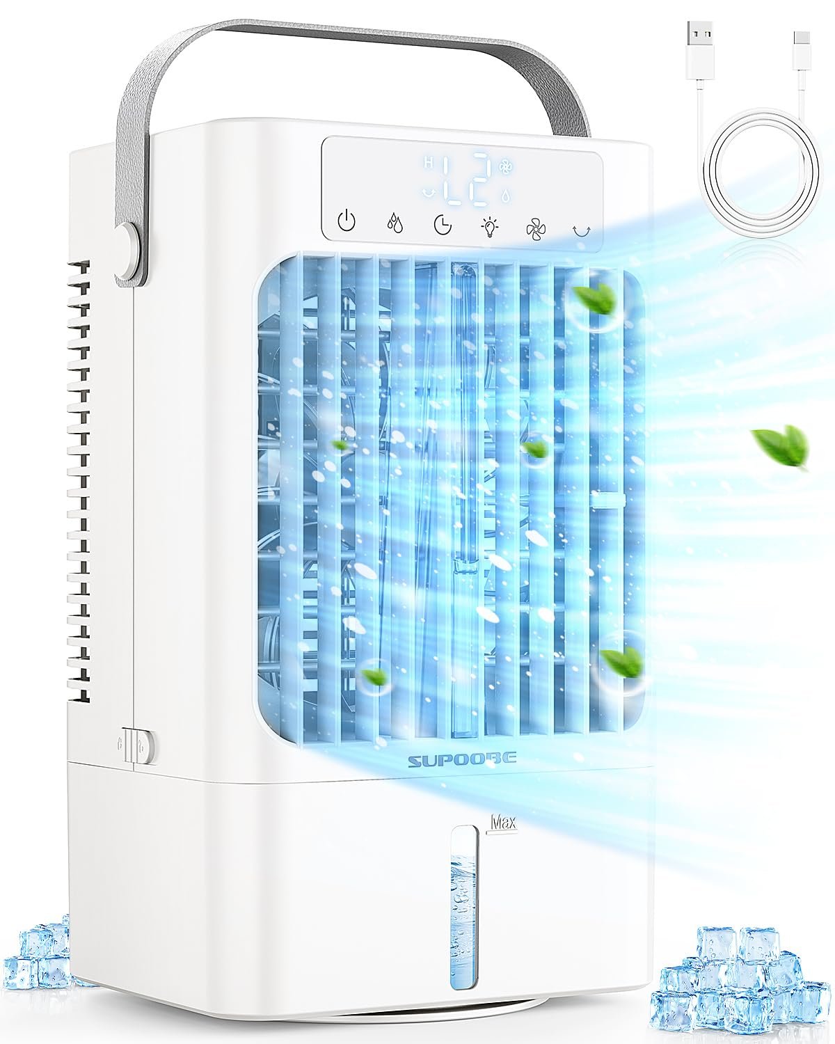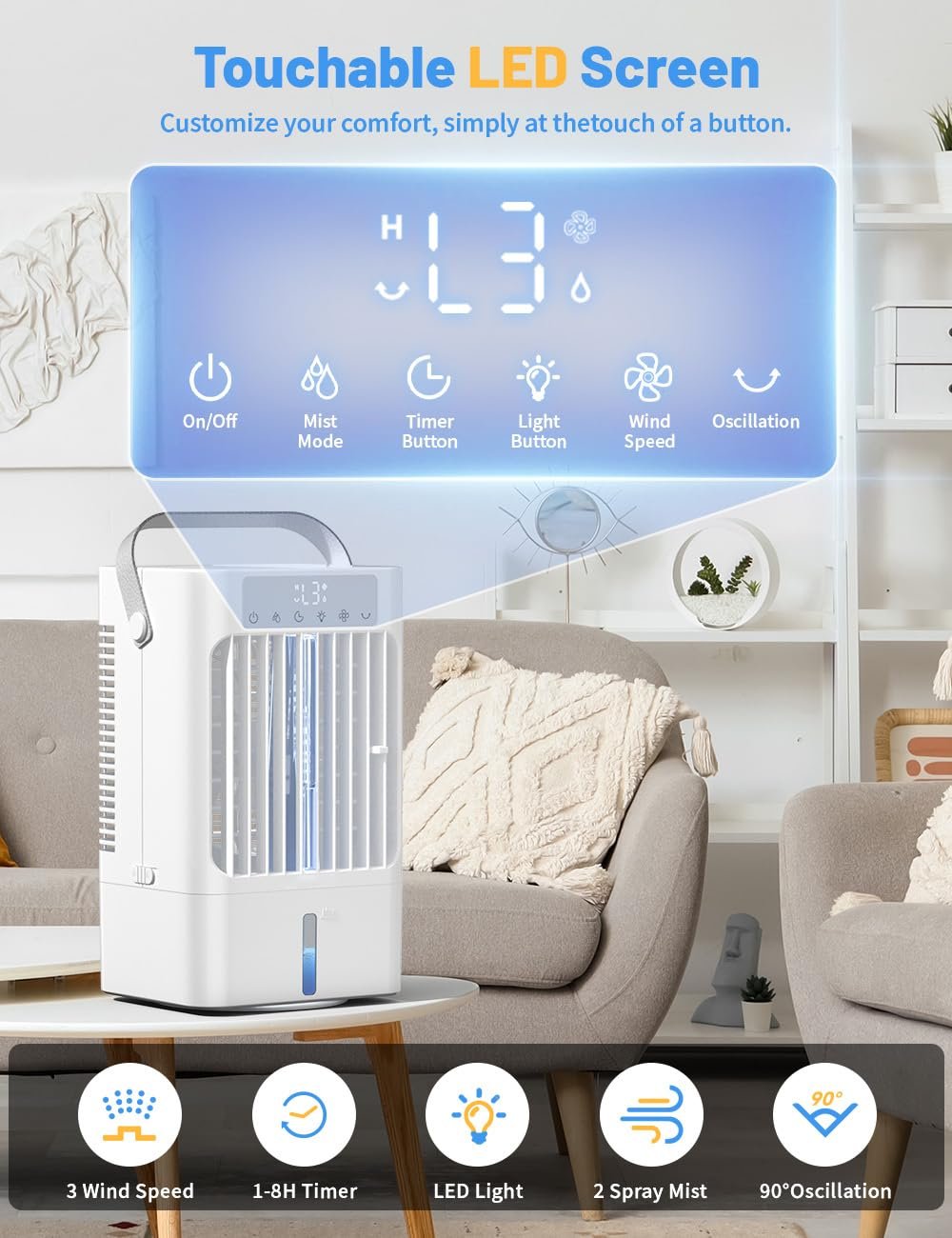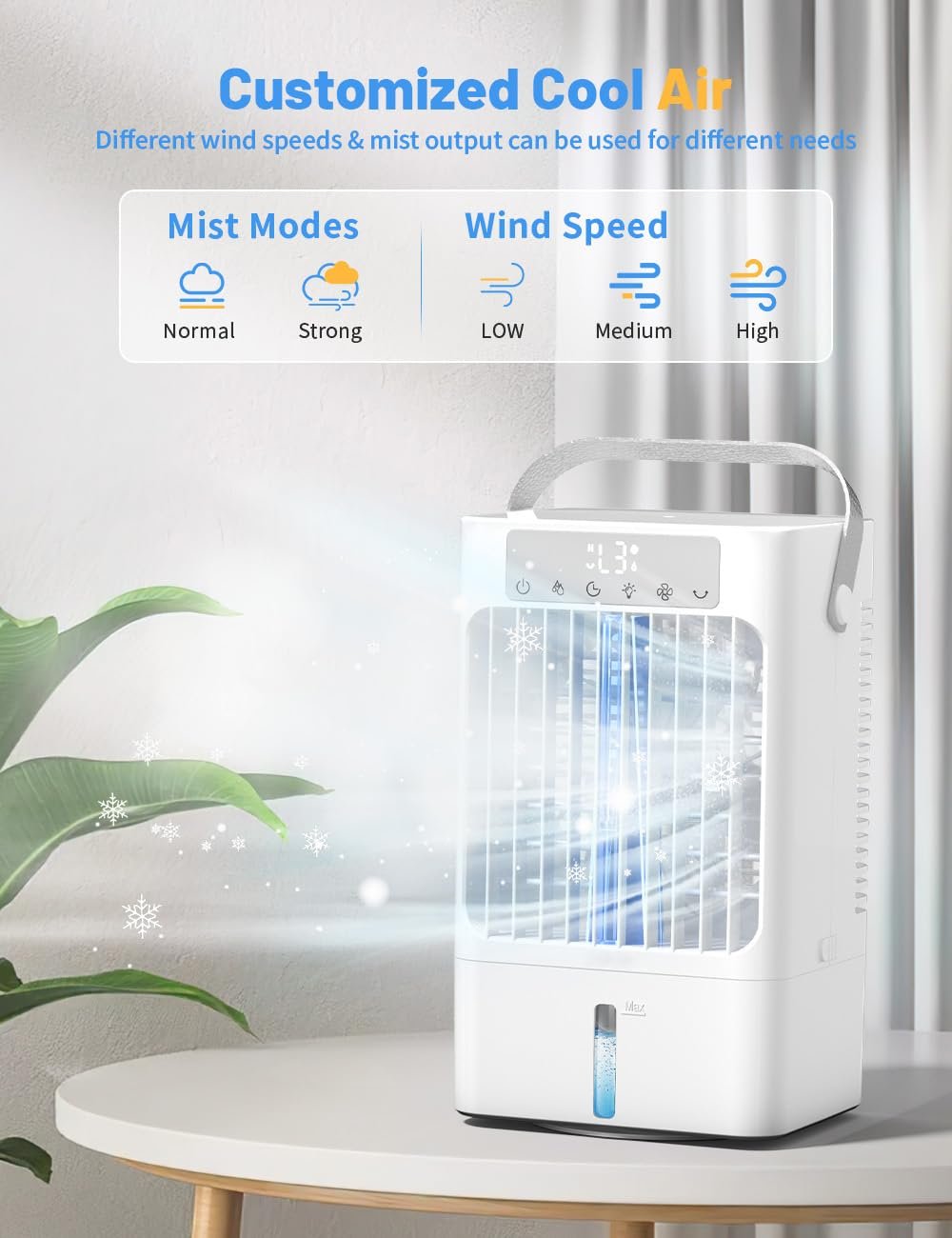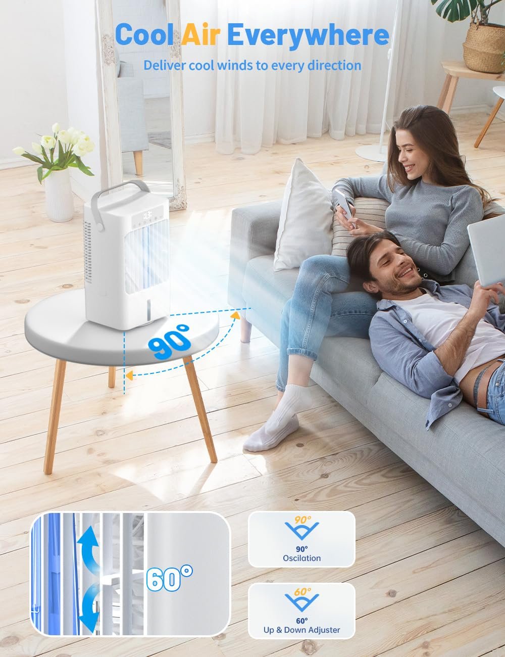 Die 90°-Oszillation ermöglicht es, die Windrichtung nach oben, unten, links und rechts anzupassen, sodass die kühle Luft gleichmäßig im Raum verteilt wird. Für ein noch intensiveres Erlebnis können Sie Eiswürfel in den Wassertank geben.