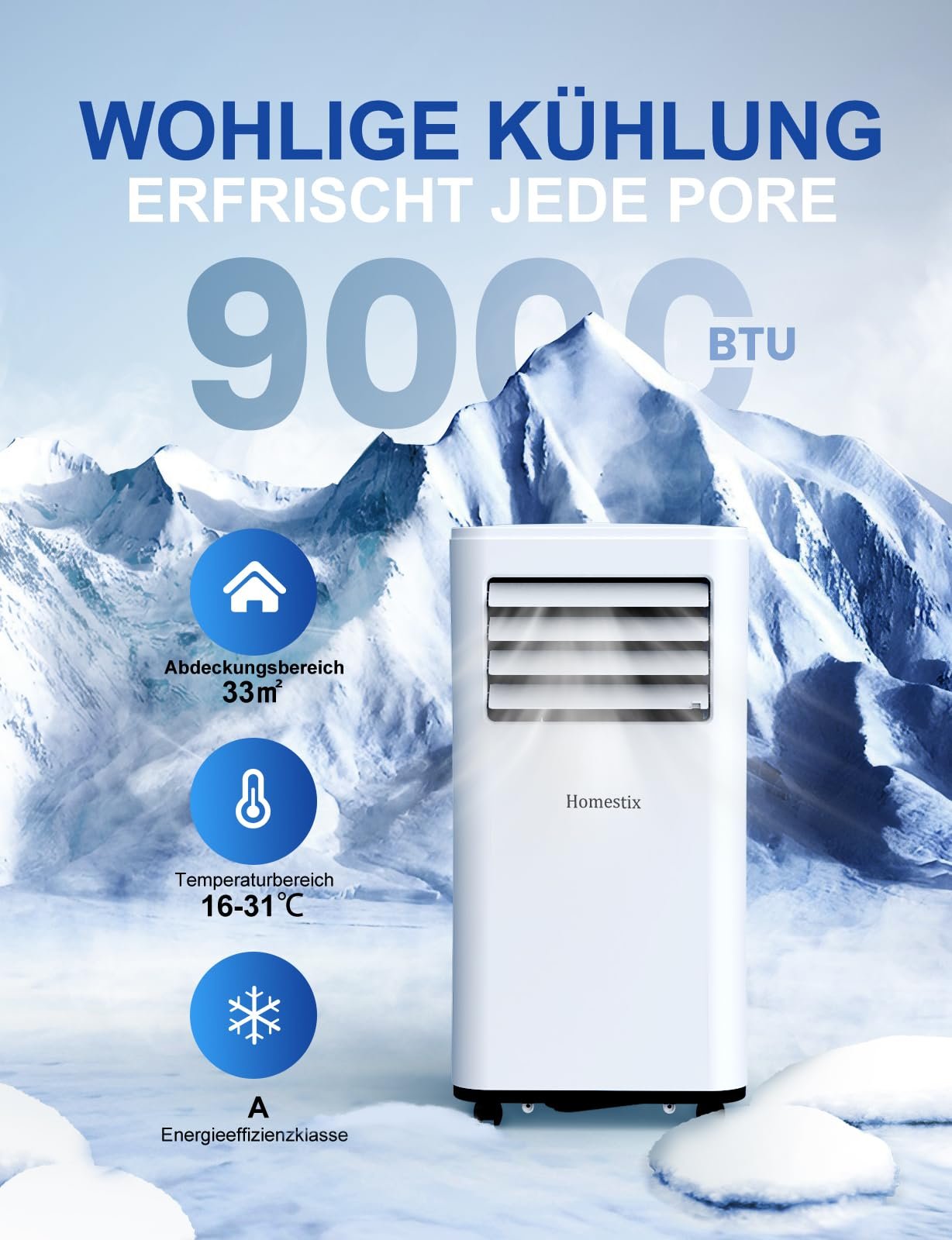 - ❄️🏠【9000 BTU/2,6 kW leistungsstarker Kompressor】 Diese mobile Klimaanlage nutzt fortschrittliche Kühltechnologie und verfügt über eine Kühleffizienz von 9000 BTU/2,6 kW, wodurch der Kühleffekt um 80 % gesteigert werden kann, und der effektive Kühlbereich beträgt bis zu 88 m³ (33㎡). Es läuft leise und liefert gleichzeitig eine solide Leistung, was es perfekt für Schlafsäle, Apartments, Lofts, Wohnmobile, Büros, Schlafzimmer oder Wohnzimmer macht.