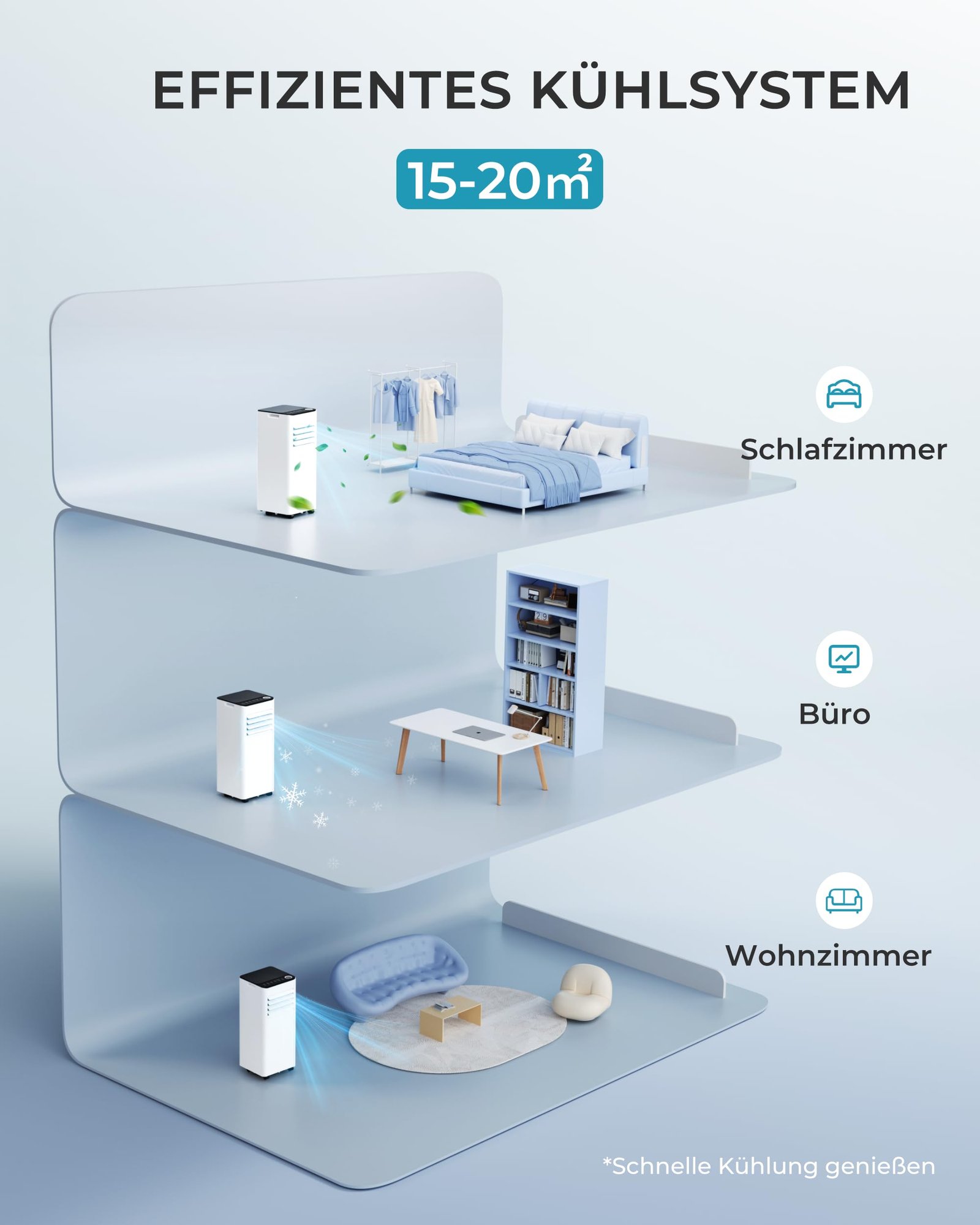- Kühlkapazität: Geeignet für Räume bis zu 20 m²