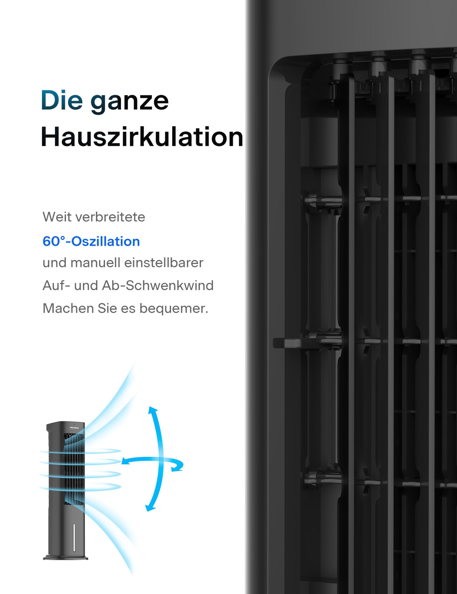 - Automatische Oszillation & Fernbedienung, 60° Schwenkfunktion und manuelle Neigungseinstellung für optimale Luftverteilung; Steuern Sie alle Funktionen per Fernbedienung, Timer (bis 7H), 3 Windmodi (Natürlich/Schlaf/Normal) oder 330m³/h Luftstrom, bequem vom Sofa aus
